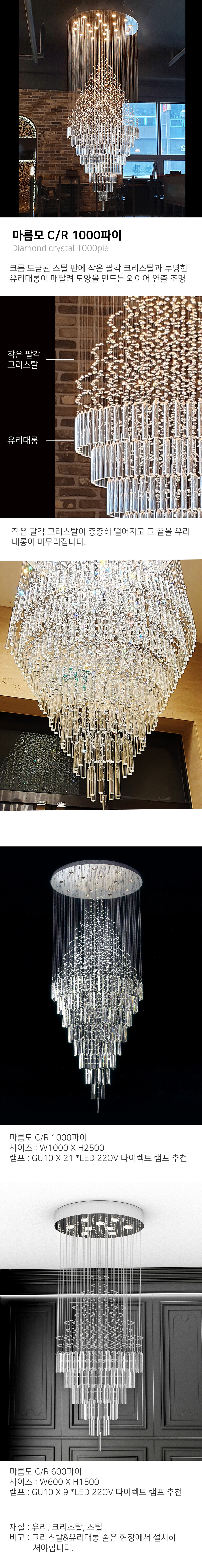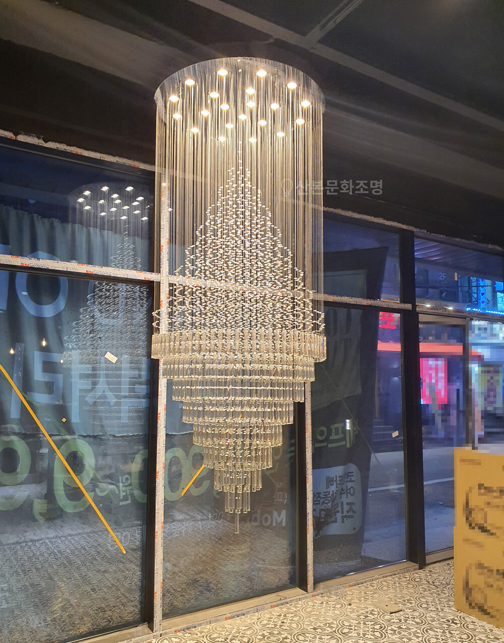 크롬 도금된 스탈 판에 유리 대롱과 작은 크리스탈들이 마름모 형태로 매달려 반짝거립니다.