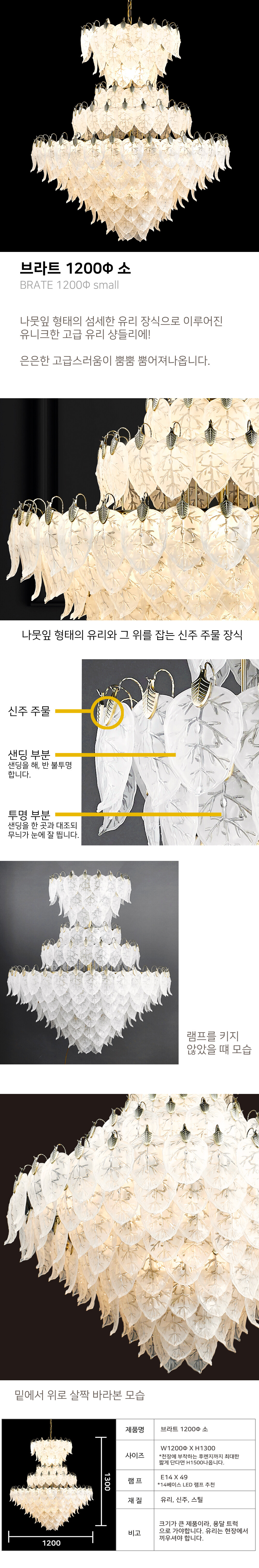나무잎 형태의 섬세한 유리장식으로 이루어진 유니크한 고급 유리 샹들리에