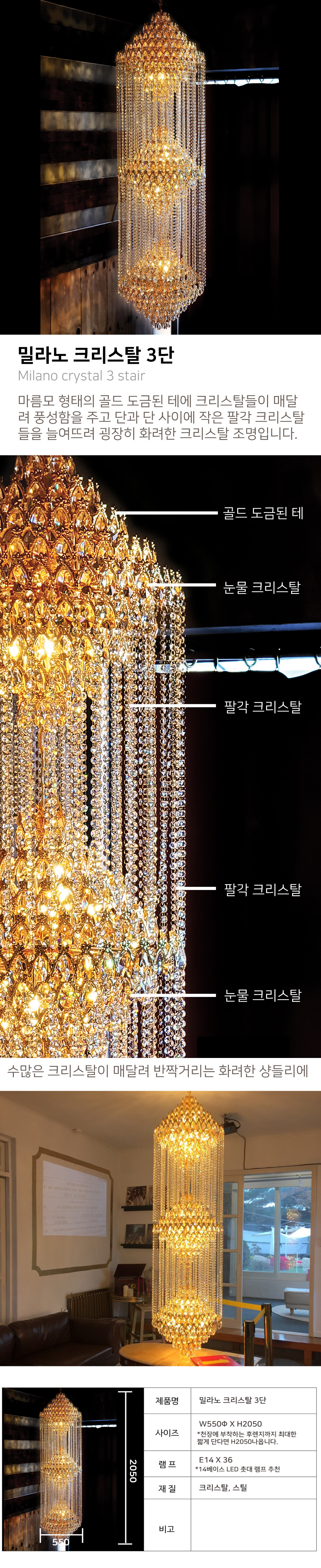 마름모 형태의 골드 도금된 테에 크리스탈들이 매달려 풍성함을 주고 단과 단 사이에 작은 팔각 크리스탈들을 늘여 뜨려 굉장히 화려한 크리스탈 조명