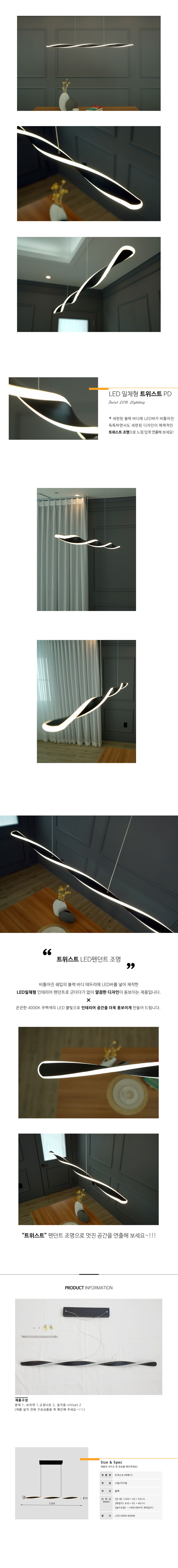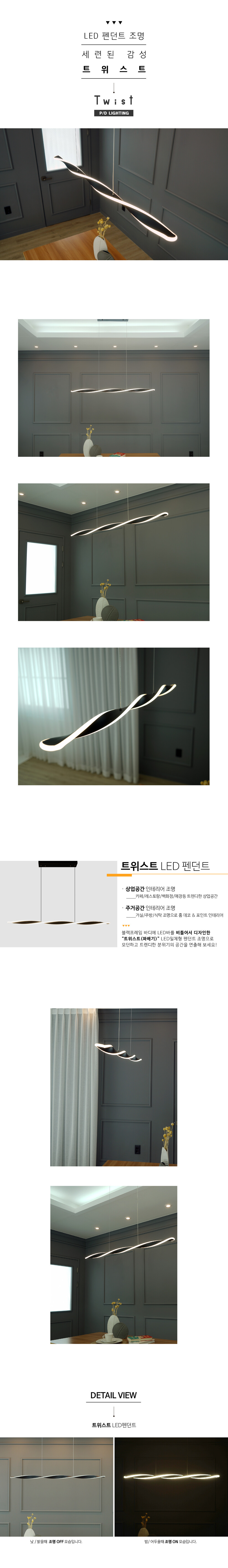 블랙프레임 바디에 LED바를 비틀어서 디자인한 트위스트(꽈배기) LED일체형 펜던트 조명으로 모던하고 트렌디한 분위기의 공간을 연출해 보세요.
