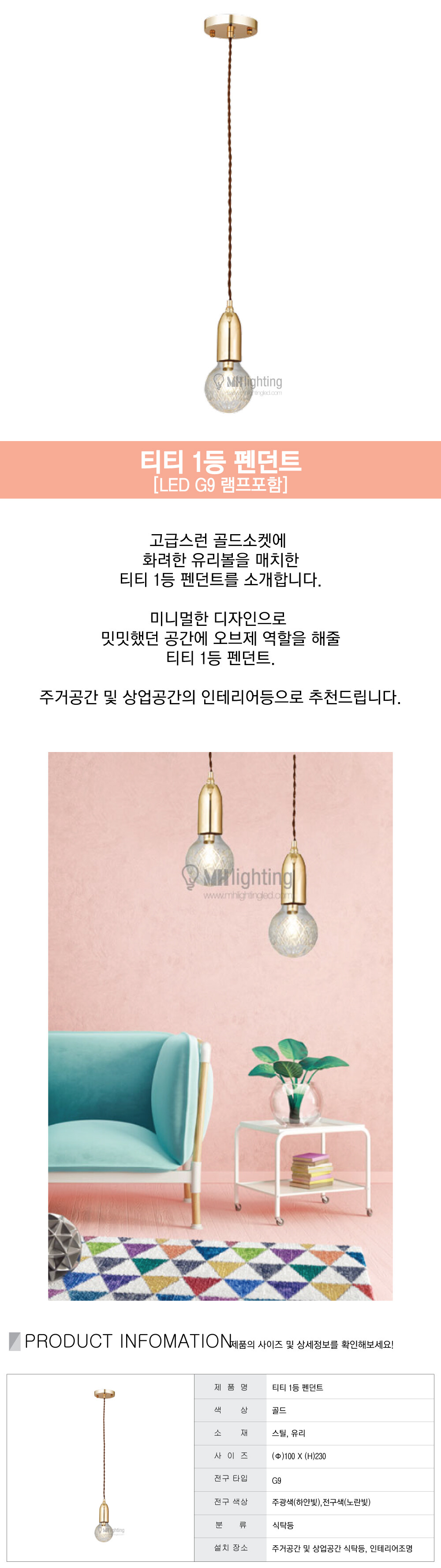 티티 1등 펜던트 [LED G9 램프포함]