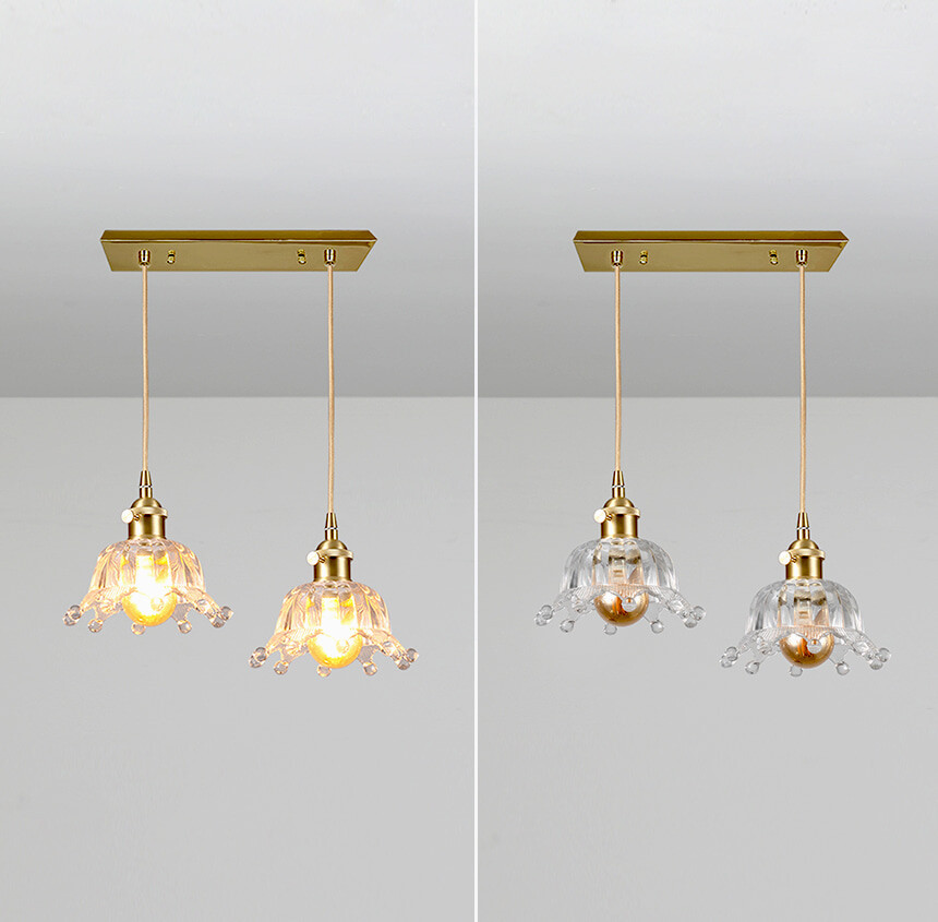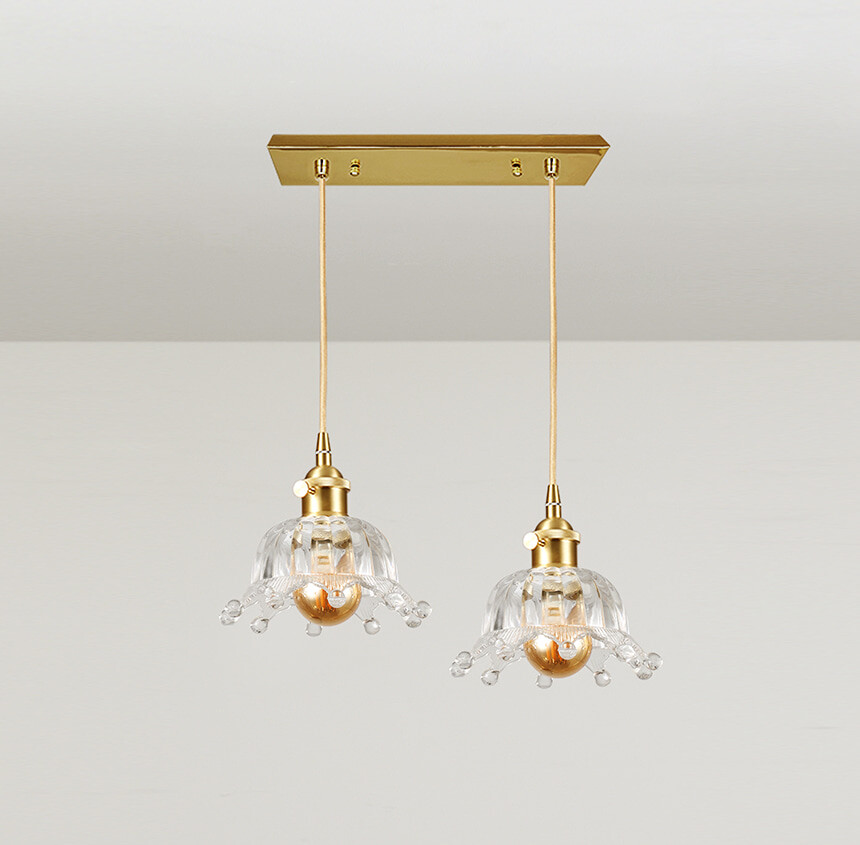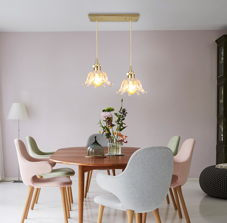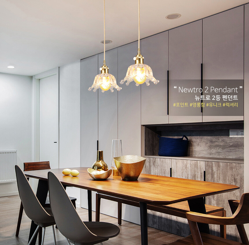 우아하며 세련된 유리 갓이 매력적인 뉴트로 펜던트 조명으로 분위기를 바 꿔보세요.