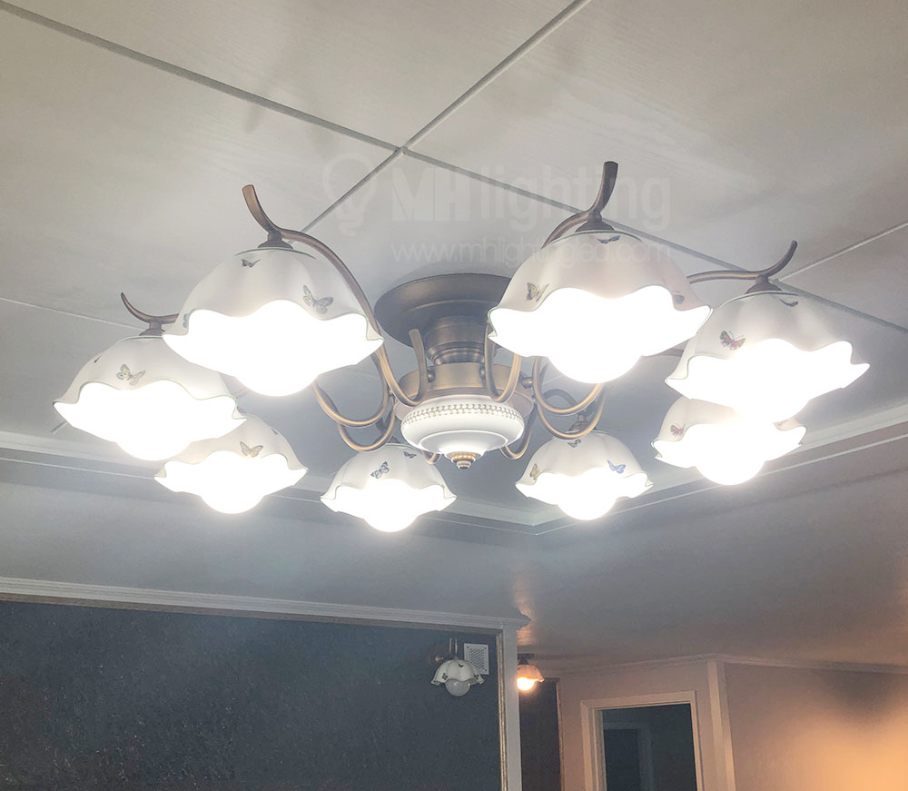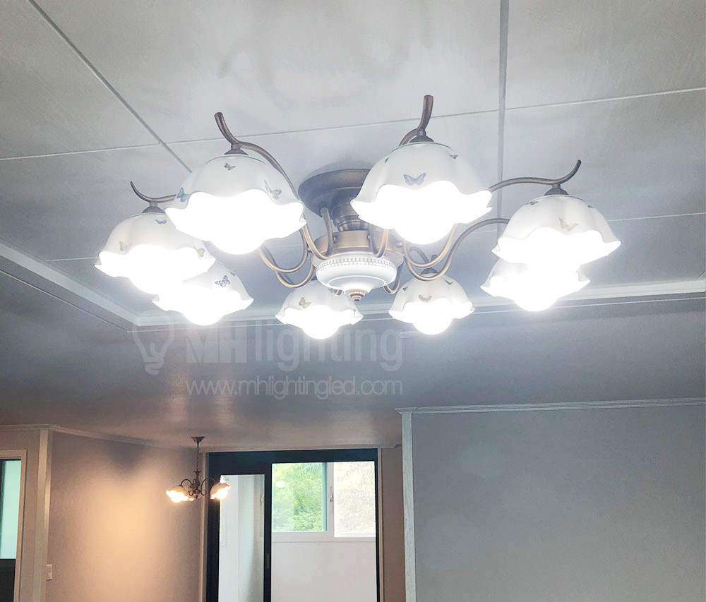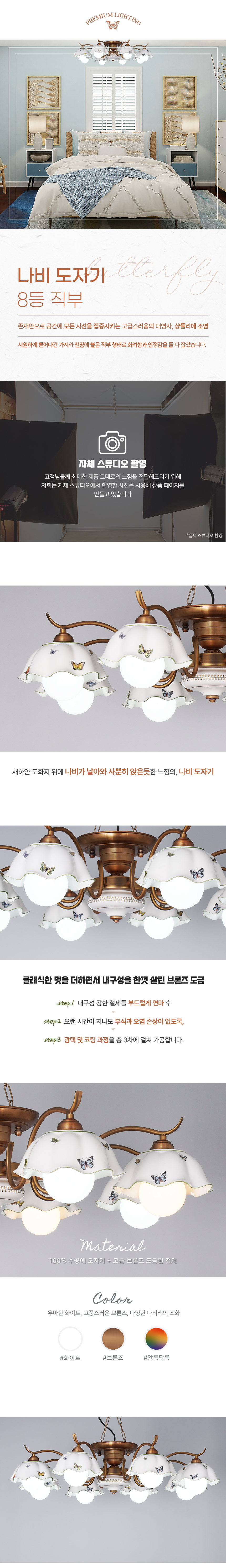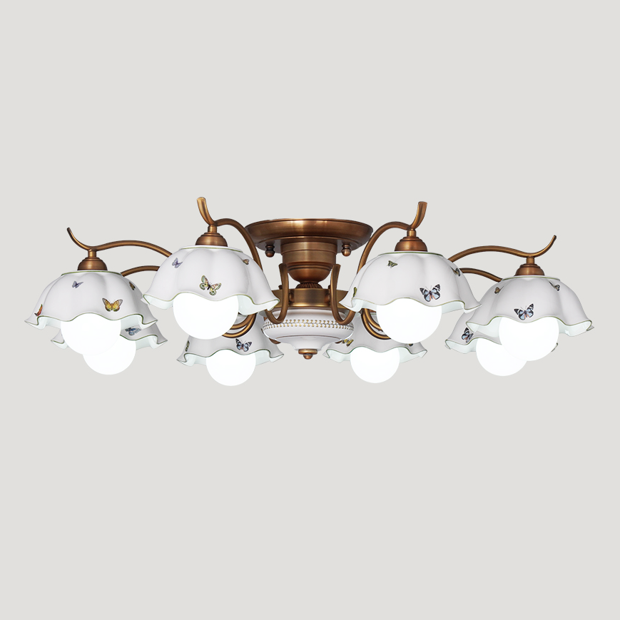 꽃잎처럼 펼쳐진 갓에 나비가 내려앉은 듯한 디자인의 도자기조명.