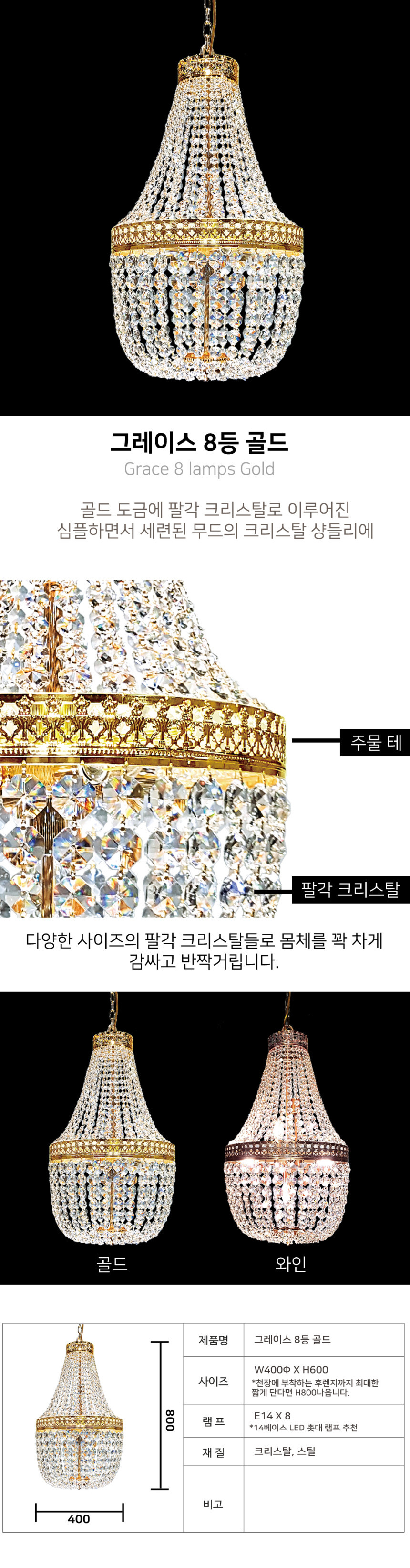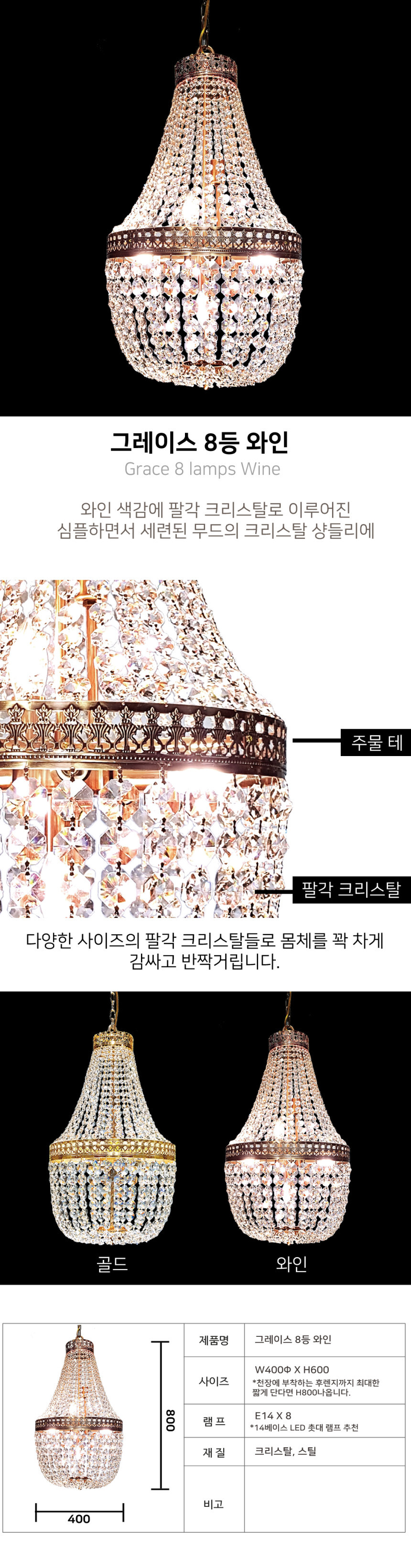세련된 골드, 와인 바디와 화려한 크리스탈이 어우러져 고급스러운 분위기를 자아내는 샹들리에