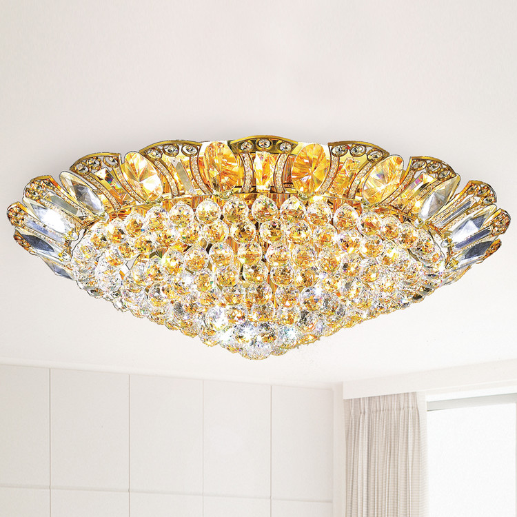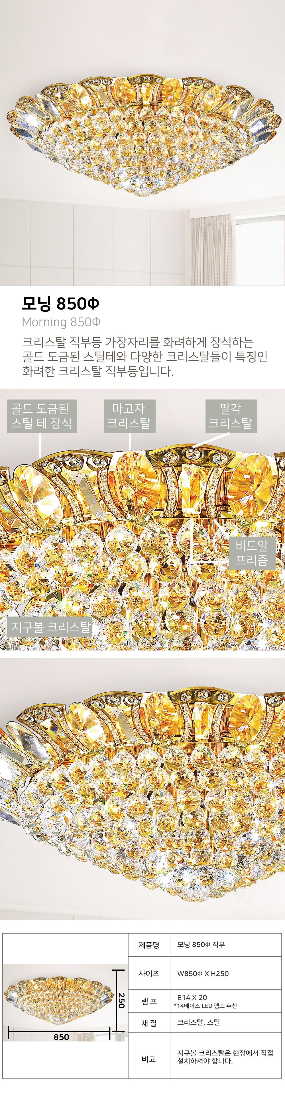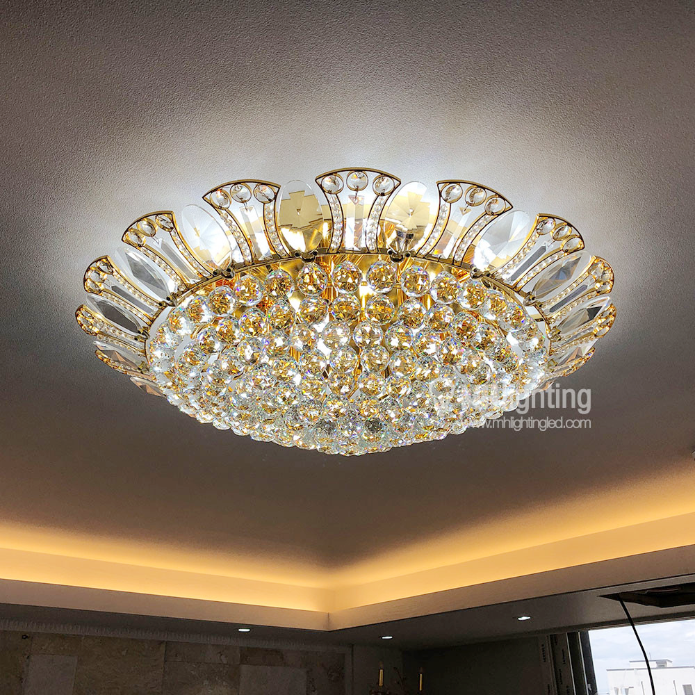 크리스탈 직부등 가장자리를 화려하게 장식하는 골드 도금된 스틸테와 다양한 크리스탈들이 특징인 화려한 크리스탈 직부등