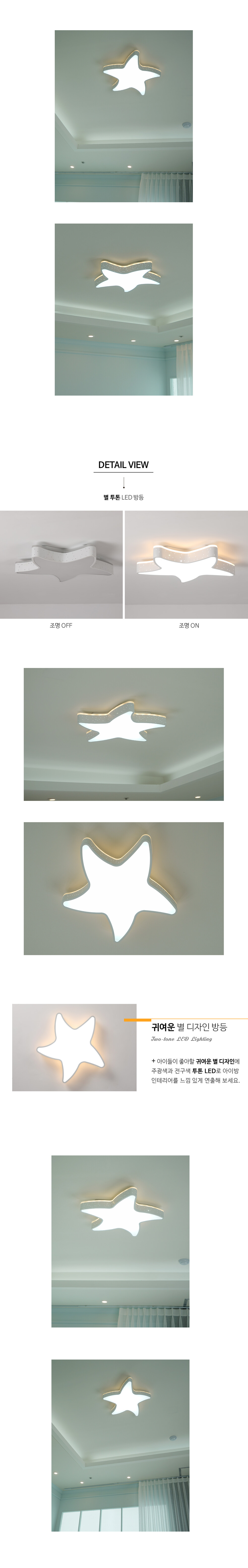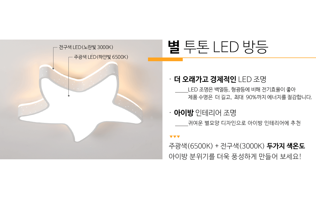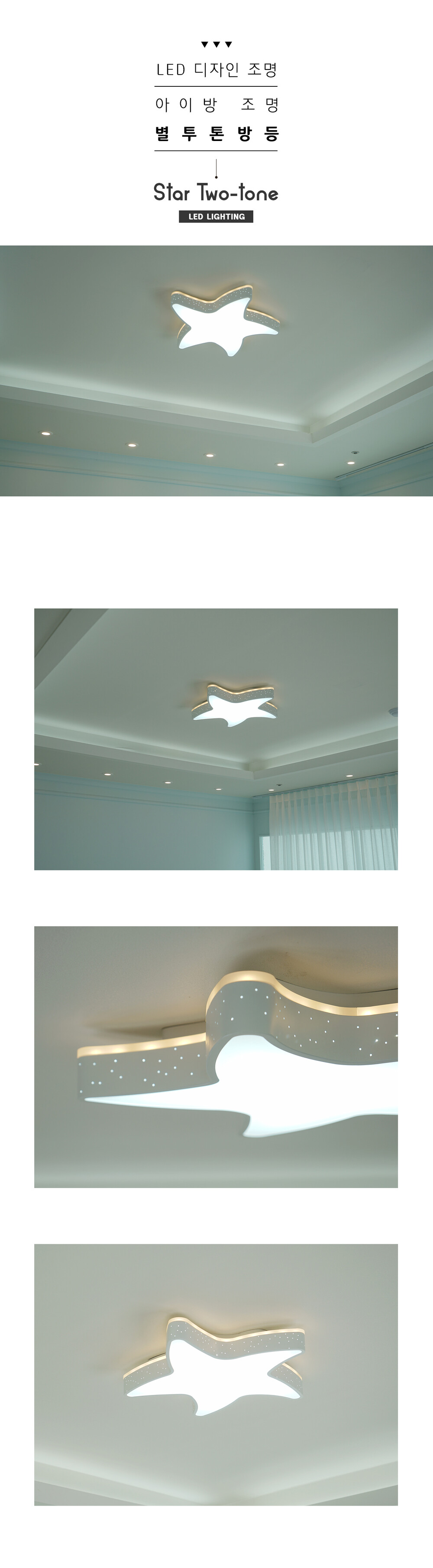 아이들이 좋아할 귀여운 별 디자인에 주광색과 전구색 투톤 LED로 아이방 인테리어를 느낌 있게 연출해 보세요.