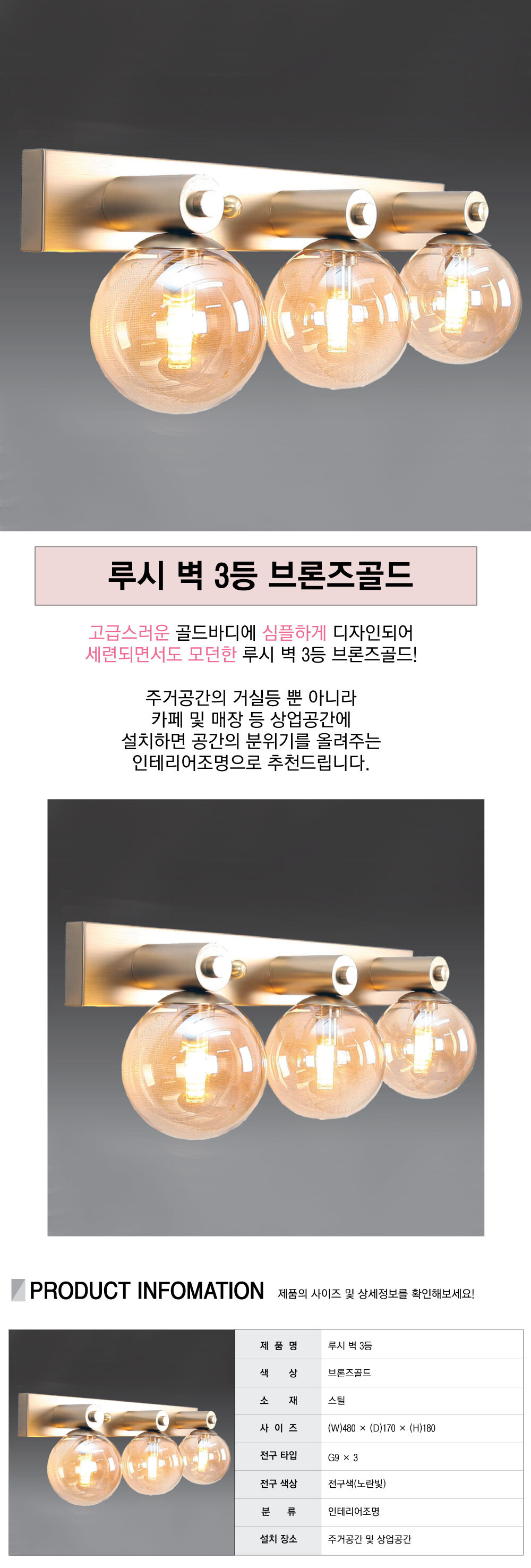 루시 3등 벽등 브론즈골드 (LED전구포함)